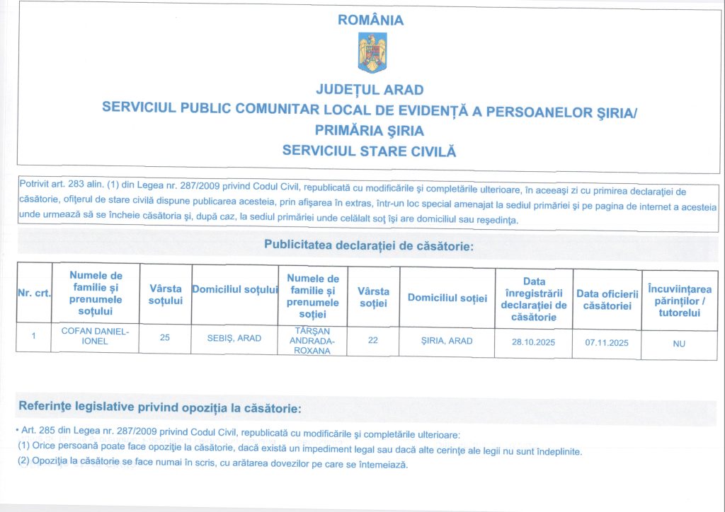 Publicație de căsătorie – Cofan Daniel-Ionel / Tărșan Andrada-Roxana